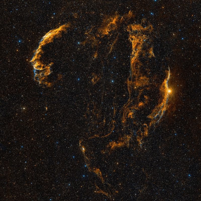 La Nebulosa del Velo está ubicada justo al este del asta izquierda de la cruz y la forman los restos de una explosión de supernova ocurrida hace varios milenios (entre 5000 y 8000 años). Cuando es fotografiada, presenta el aspecto de una serie de delgados filamentos rojizos y azulados, enrollados en torno a la estrella 52 Cygni. Se encuentra a unos 1500 años luz de nosotros.